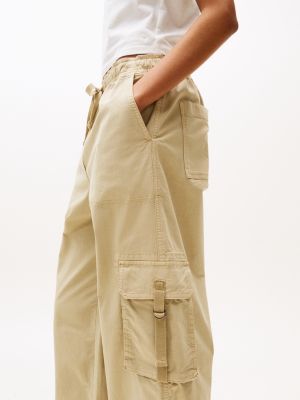 These stretch cotton cargo trousers are cut to a loose fit and feature multiple pockets, reinforcing the utility-inspired style.