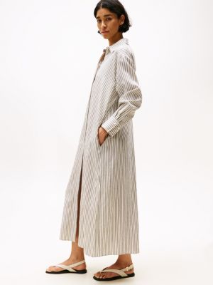 This maxi-length dress combines an oversized shirt silhouette with a box pleat and slits for a graceful drape.