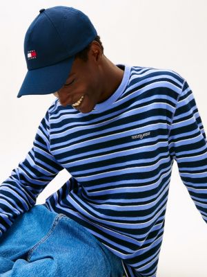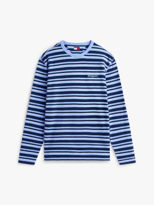 This long-sleeved T-shirt in pure cotton crepe jersey showcases an all-over striped pattern and serif script logo embroidery on the chest.
