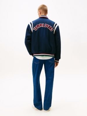Die Logo-Applikationen aus Frottee setzen auf dieser wattierten Bomberjacke mit Streifen im College-Stil strukturierte Akzente.