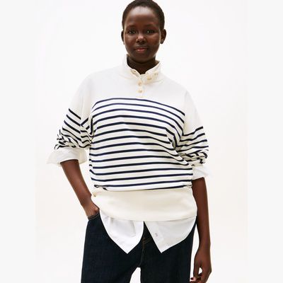 Die zeitlosen Streifen und die goldfarbenen Knöpfe am Ausschnitt verleihen diesem Pullover aus reiner gekämmter Baumwolle einen edlen Look.