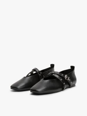 Überkreuzte Riemen mit Metall-Ösen machen diesen Mary Jane mit Square Toe zum Hingucker.