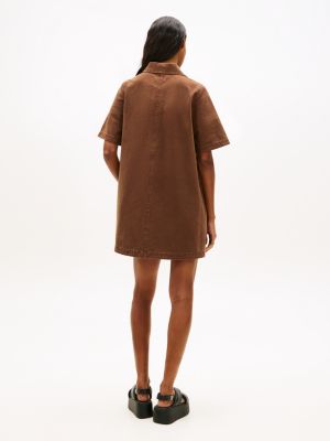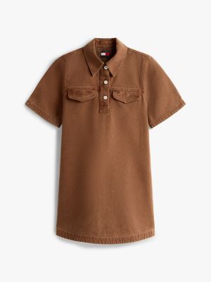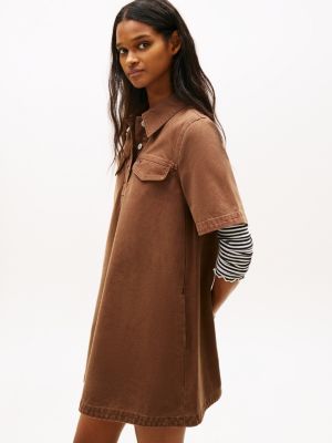 Dieses kurzärmlige A-Linien-Kleid mit Hemdkragen und Ziertaschen auf der Brust bringt etwas Utility-Chic in deine Garderobe.