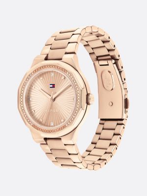 Dank nelkenvergoldetem Edelstahl und kristallverziertem Design begeistert diese Uhr mit einem femininen, eleganten Look.