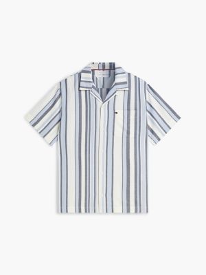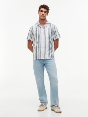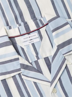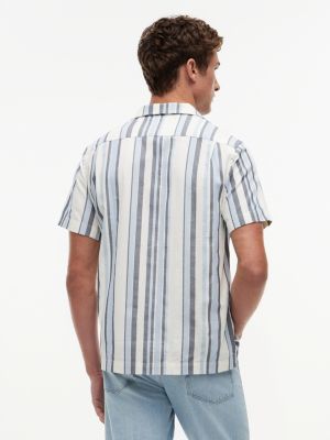 Perfekt für sonnige Tage präsentiert dieses kurzärmelige Hemd ein dezentes, aber edles, strukturiertes Streifen-Design auf strukturiertem Dobby-Gewebe aus reiner Baumwolle.