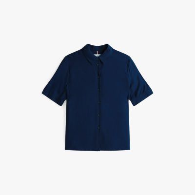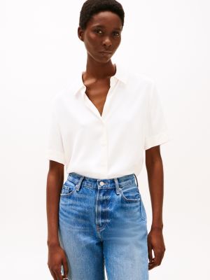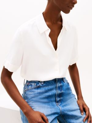 Fließender Stoff mit femininer Drapierung unterstreicht die Relaxed Fit Silhouette dieses Kurzarm-Hemds.