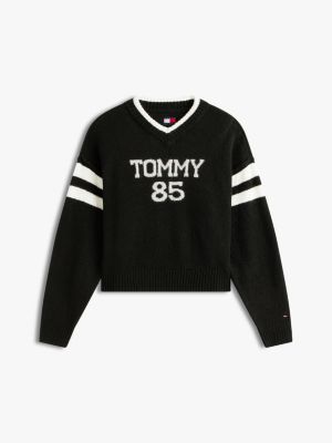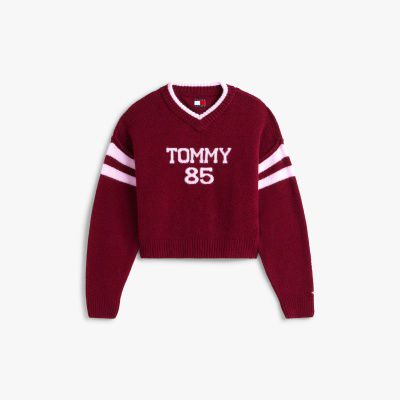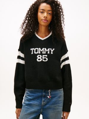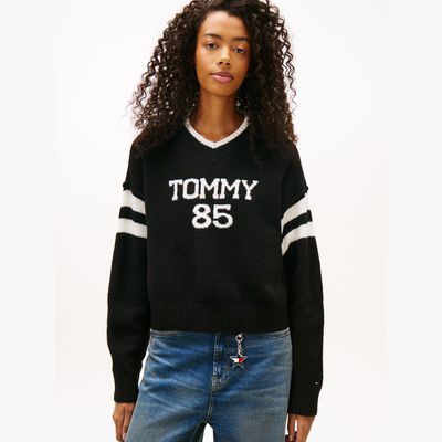 Ein auffälliges Intarsien-Logo auf der Brust verleiht diesem Relaxed Fit Strickpullover mit V-Ausschnitt sportliche College-Vibes.