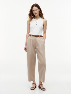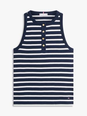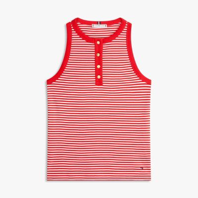 Goldfarbene Knöpfe mit geprägtem Branding setzen glamouröse Akzente auf diesem Slim Fit Top mit Henley-Kragen – ideal für auffällige Freizeitlooks.