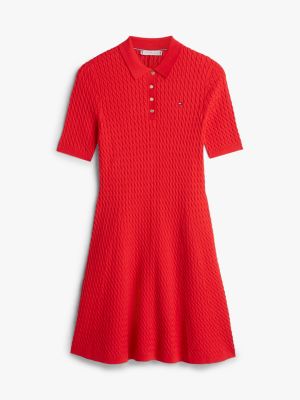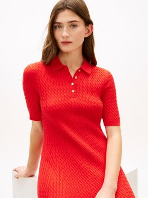 Dieses Kurzarm-Minikleid mit Zopfmuster aus feinem Strick verwandelt den Polo-Klassiker in ein feminines Design. Goldfarbene Knöpfe setzen dabei elegante Akzente.